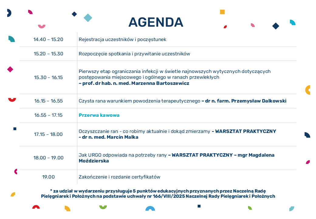 Za udział w wydarzeniu przysługuje 5 punktów edukacyjnych przyznanych przez Naczelną Radę Pielęgniarek i Położnych na podstawie uchwały nr 166/VIII/2025 Naczelnej Rady Pielęgniarek i Położnych